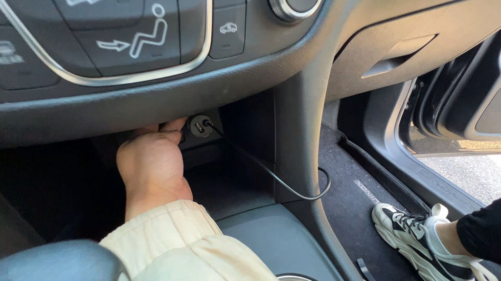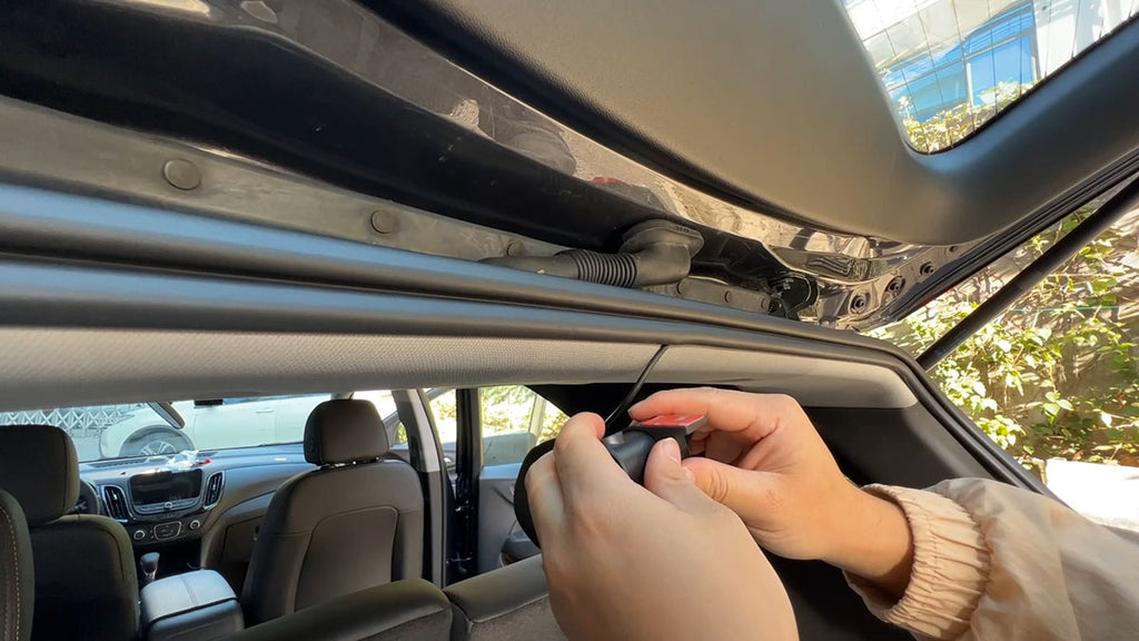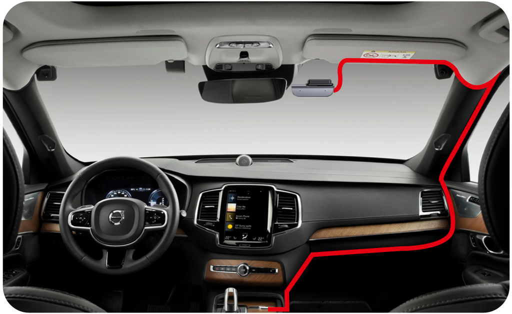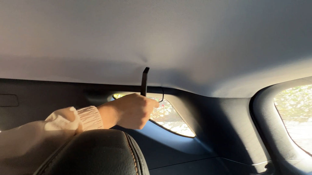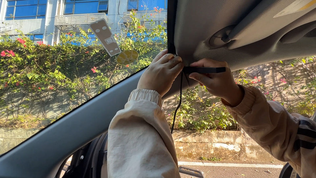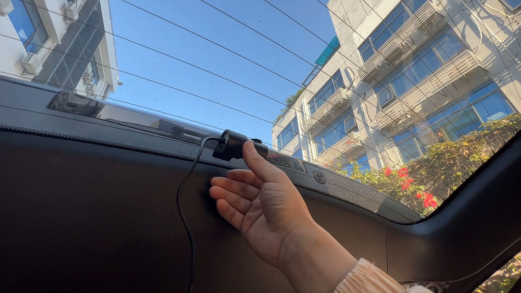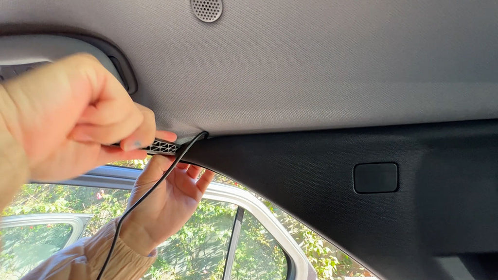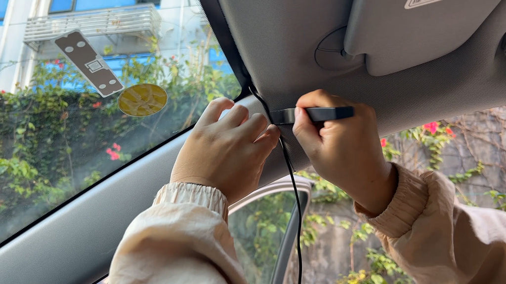 Find the car charger, plug its head into the Dash Cam, and cleverly hide the cable in the gap between the front windshield and the roof cover. You can use cable clips for stability.