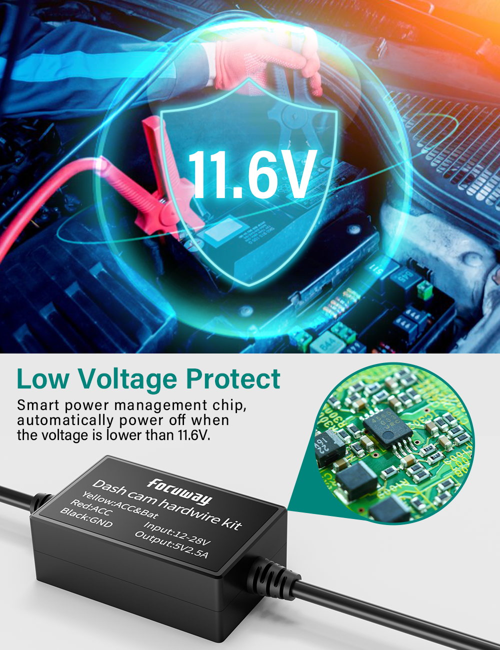 - Low Voltage Protection – Hardwire kit equipped with a sensitive power management chip, it automatically cuts off the power supply to the dash cam when the voltage drops below 12V, preserving enough power to start the engine.