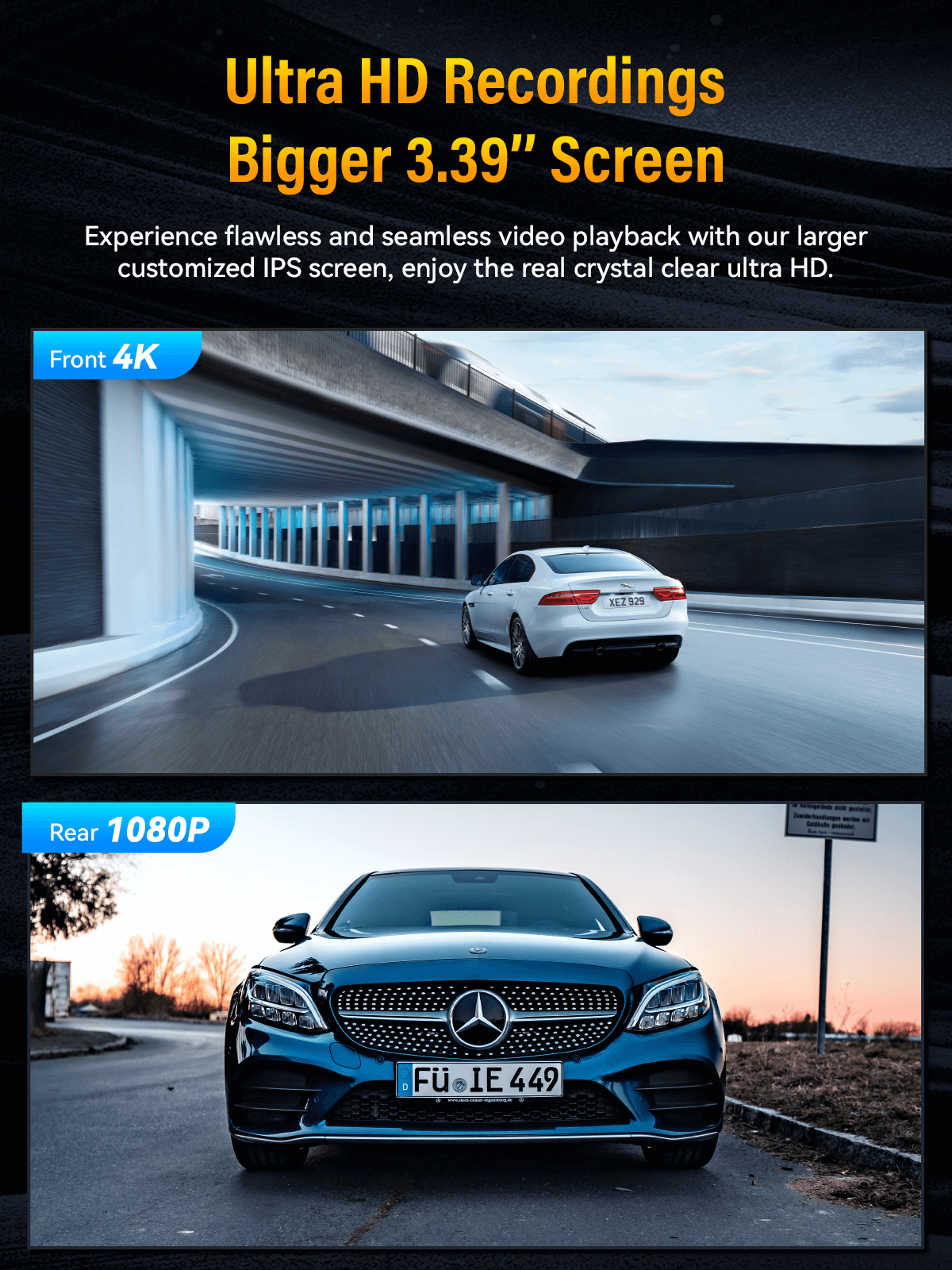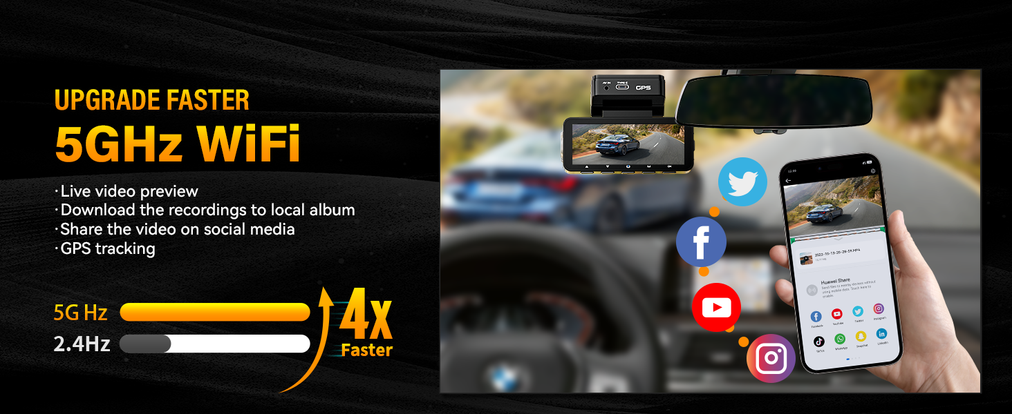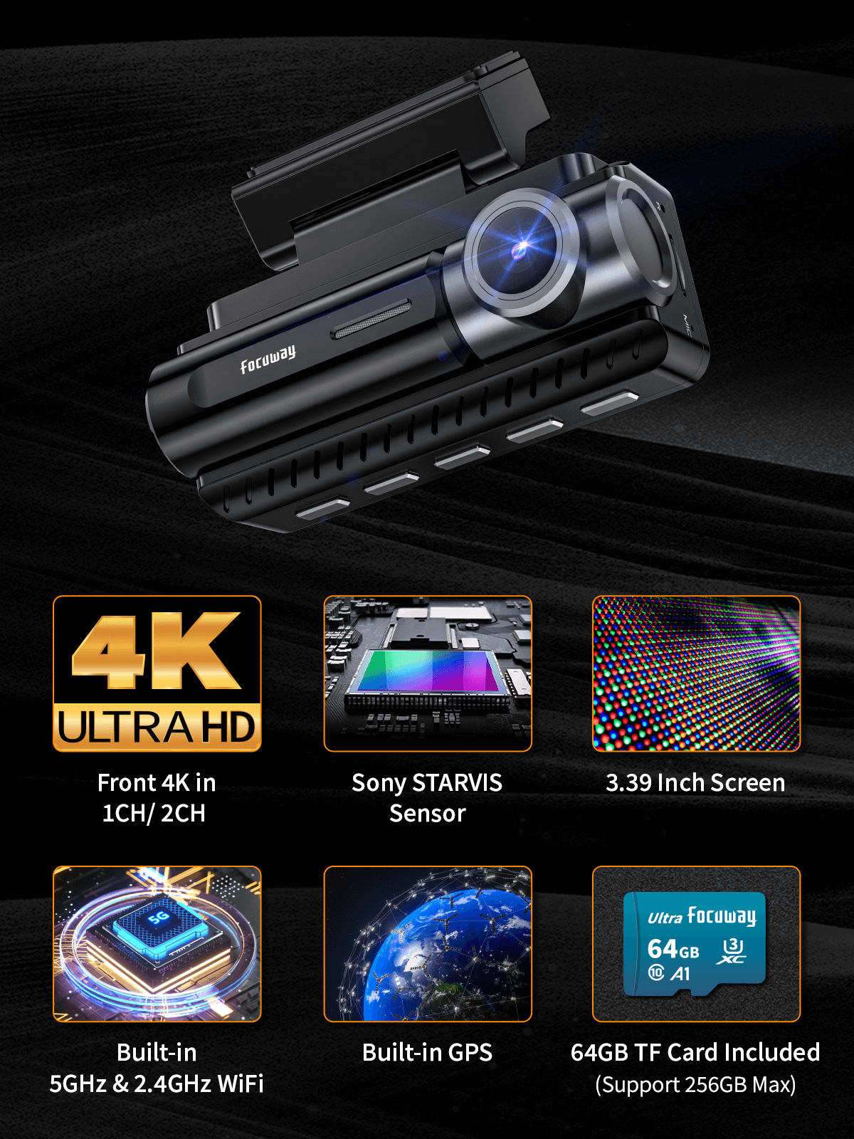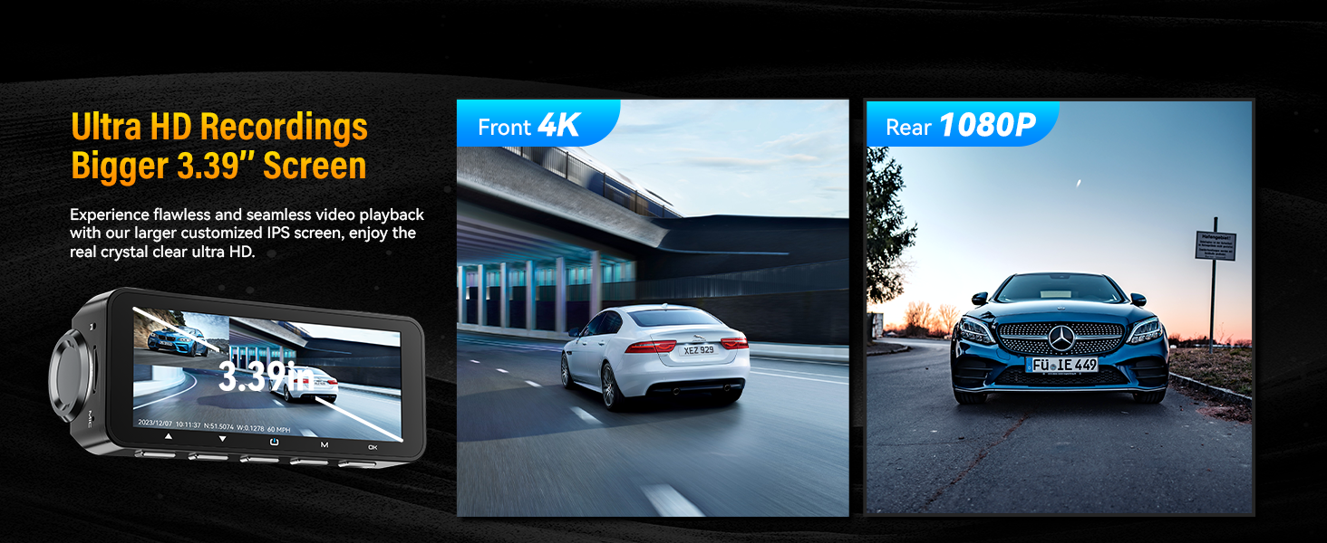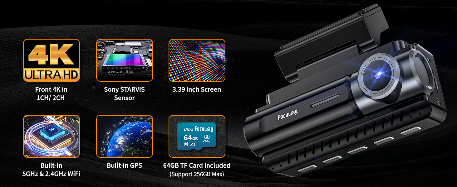 Dash Cam Front Rear 4K Built-in GPS 5GHz WiFi, 3.39’’ IPS Screen, Voice Control, Dual Dash Camera for Cars Free 64GB SD Card, Super Night Vision, 24H Parking Monitor, Supercapacitor, Type C, WDR