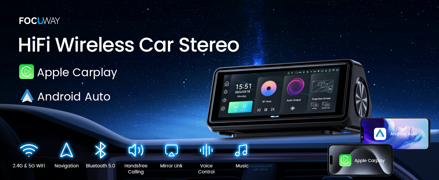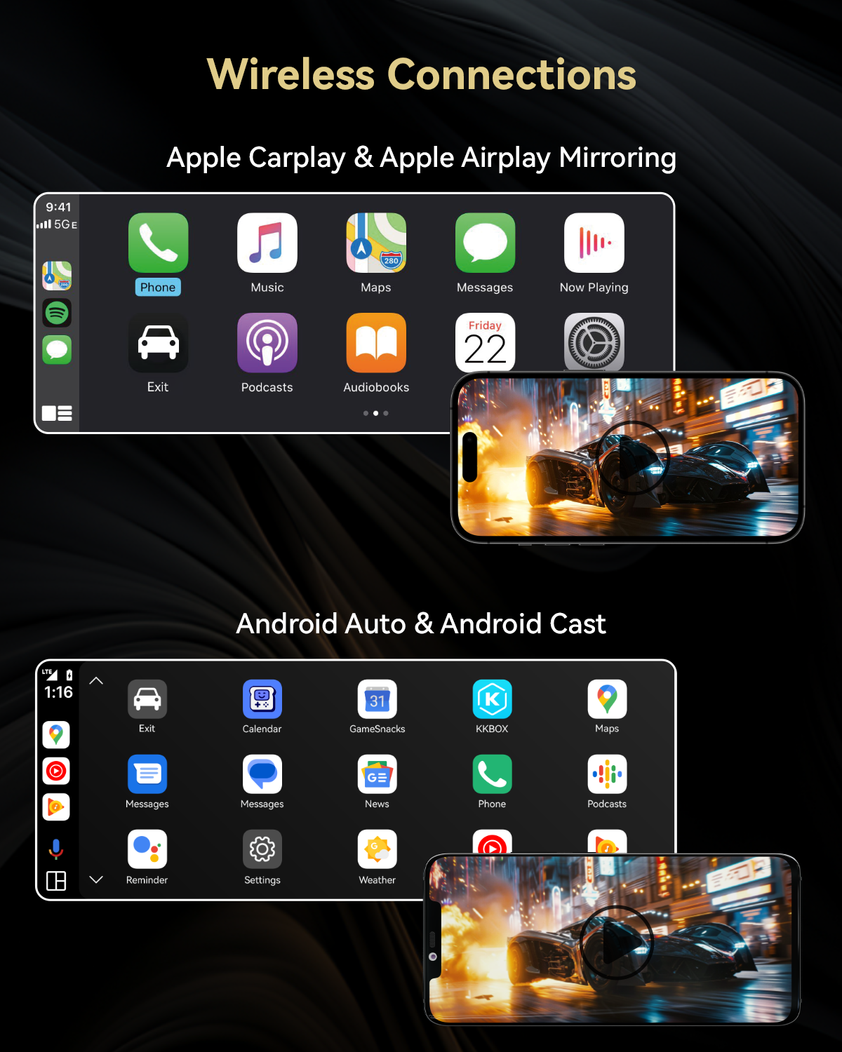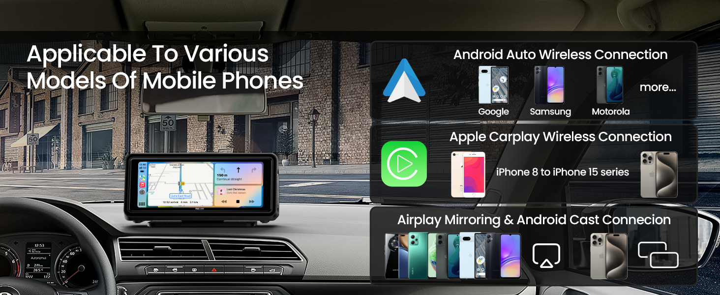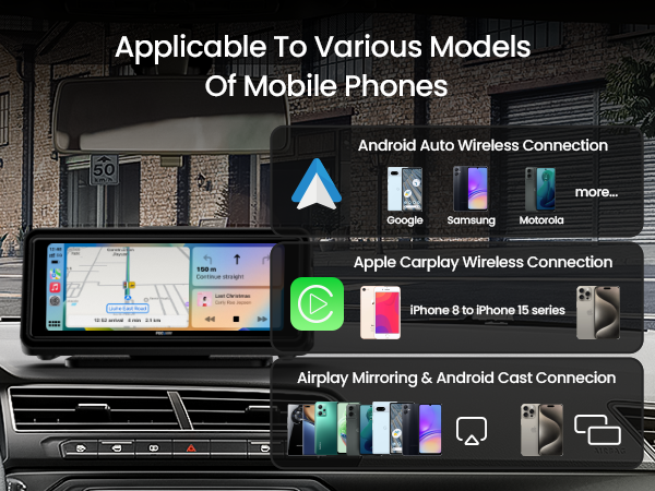 - 【 Wireless Connection】Supporting wireless Apple CarPlay and Android Auto connection brings revolutionary changes to your driving experience. Just a simple one-time connection and the system will be able to automatically connect seamlessly next time. It can easily integrate your smartphone functions, providing multi-functional services such as hands-free calling, replying to text messages, accurate navigation, and music playback, ensuring your convenience and safety while driving.