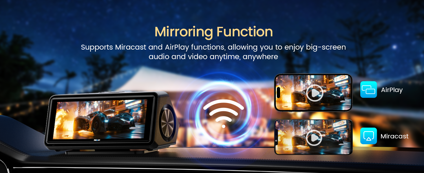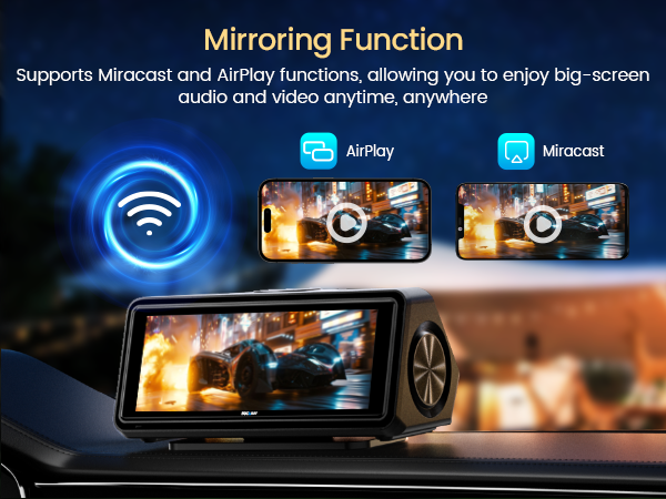 - 【Mirroring Function】 allows drivers to directly mirror the screen content of an iPhone or Android phone to the screen. Using Apple AirPlay, iPhone users can enjoy a seamless multimedia experience, including music, video, and photo playback, while maintaining voice interaction with Siri. Android Cast provides similar convenience for Android users, enabling voice control and application access through Google Assistant and improving convenience and safety while driving.
